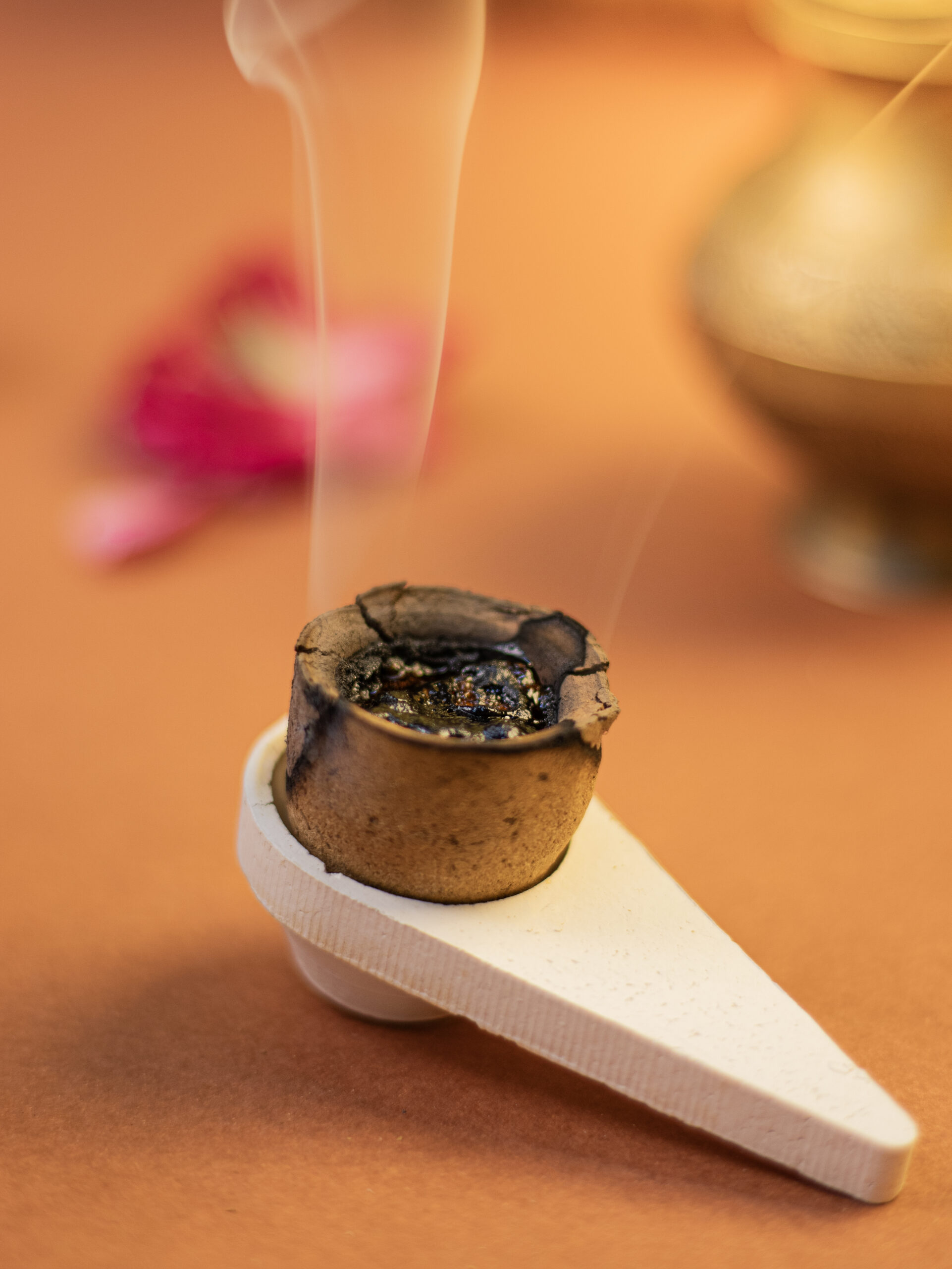 Simply, light the tip of the cup till red hot and place it in a fireproof holder. Let the soft trails of sacred smoke fill your space with peace and purity.